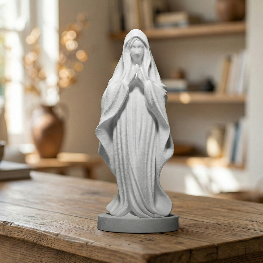 Mais do que uma peça decorativa, uma presença de luz e paz para o seu lar. Esta imagem de Santa Maria foi esculpida com traços suaves e modernos, capturando o momento sublime de oração e entrega. Sua estética minimalista permite que ela se integre perfeitamente a qualquer estilo de decoração, do clássico ao contemporâneo.