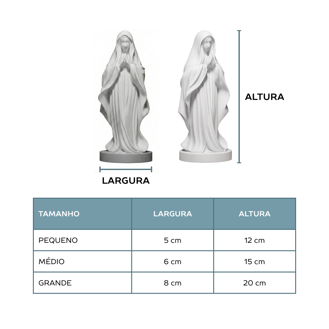 O destaque fica por conta de sua textura exclusiva trazendo sofisticação e nobreza à peça. Produzida em material de alta tecnologia e resistência, ela supera a fragilidade do gesso e da cerâmica: é uma imagem feita para durar, resistir ao tempo e ser manuseada sem medo. Escolha o tamanho que melhor harmoniza com seu altar, mesa de cabeceira ou cantinho de oração.