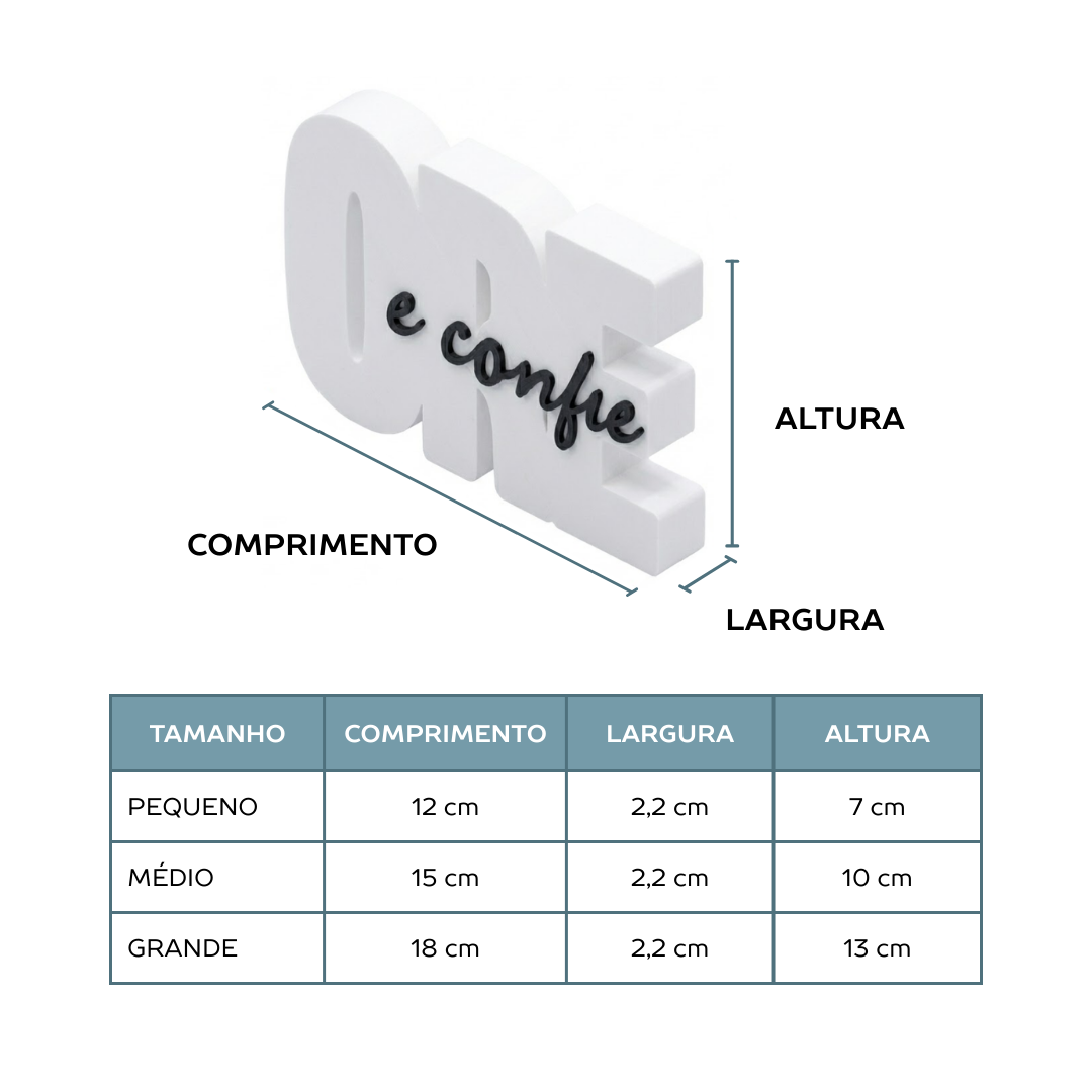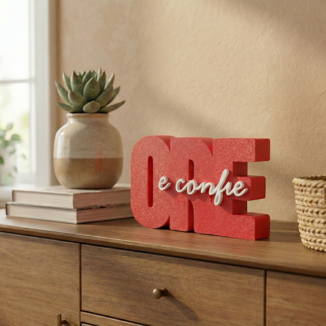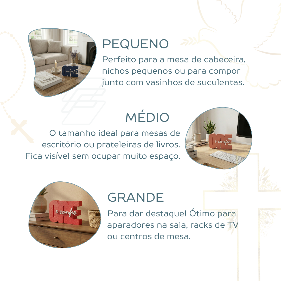 Mais do que um objeto de decoração, um lembrete diário de esperança. O letreiro ‘Ore e Confie’ foi desenhado para trazer paz e beleza ao seu ambiente favorito, seja na mesa de trabalho, na estante da sala ou no cantinho de oração.