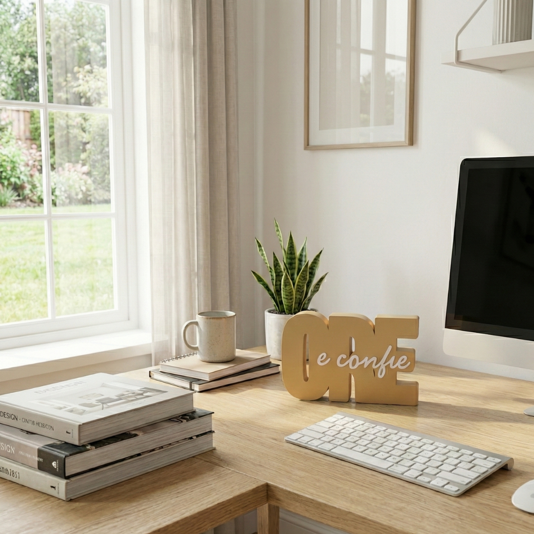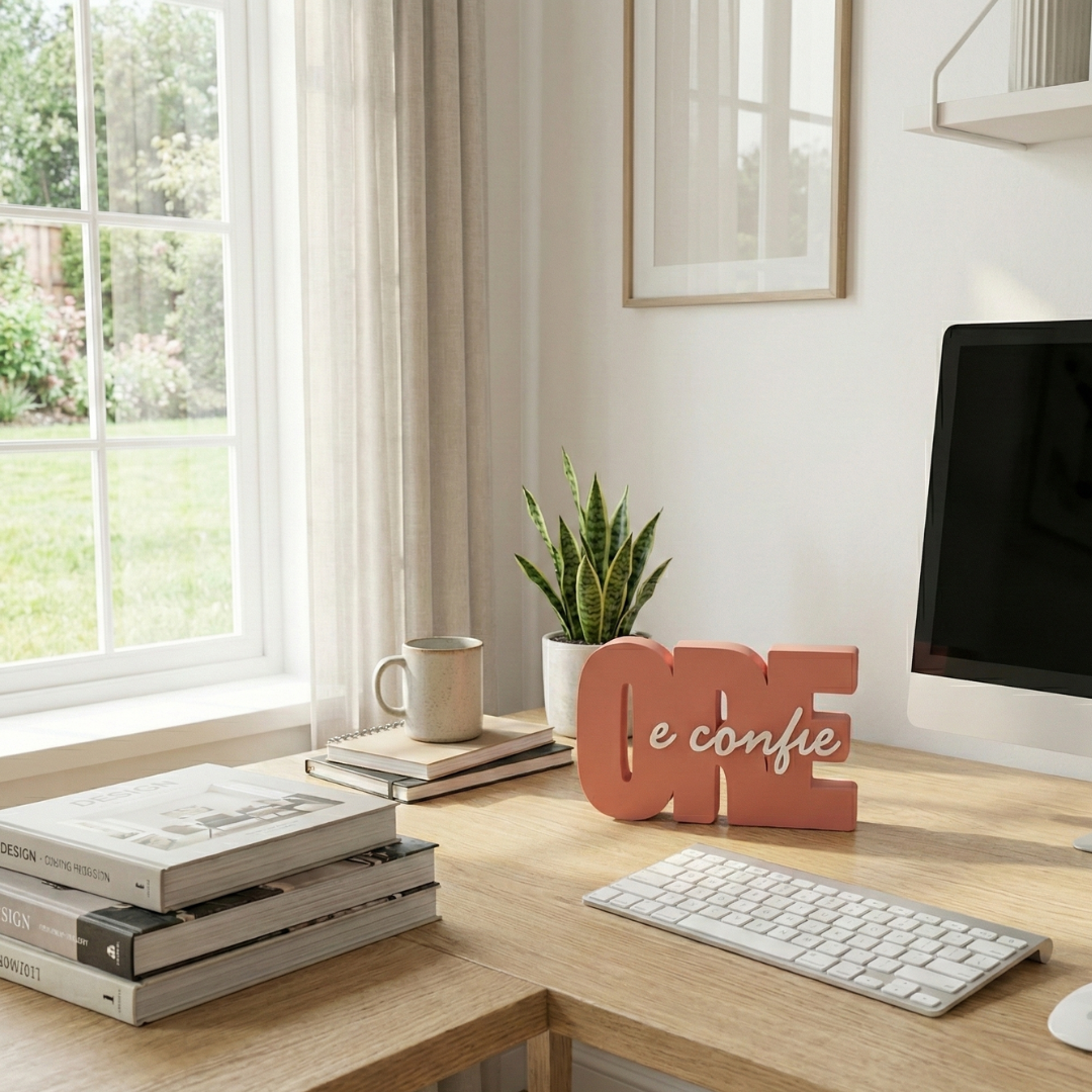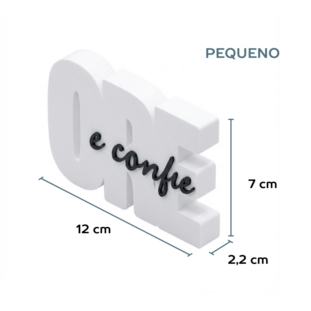 Mais do que um objeto de decoração, um lembrete diário de esperança. O letreiro ‘Ore e Confie’ foi desenhado para trazer paz e beleza ao seu ambiente favorito, seja na mesa de trabalho, na estante da sala ou no cantinho de oração.