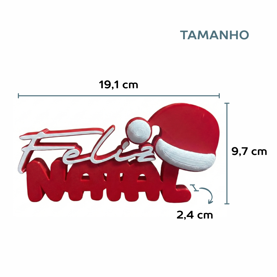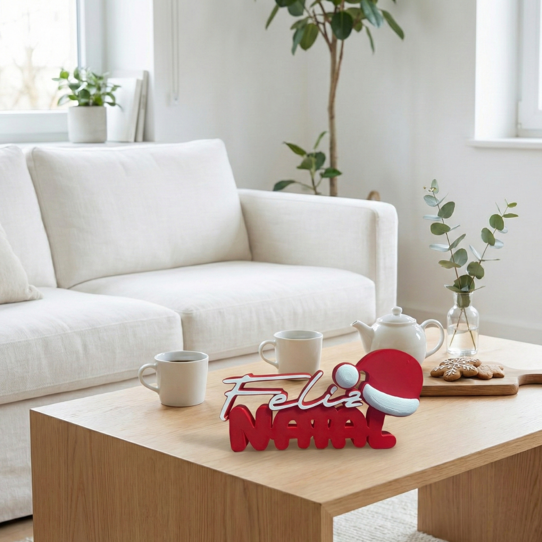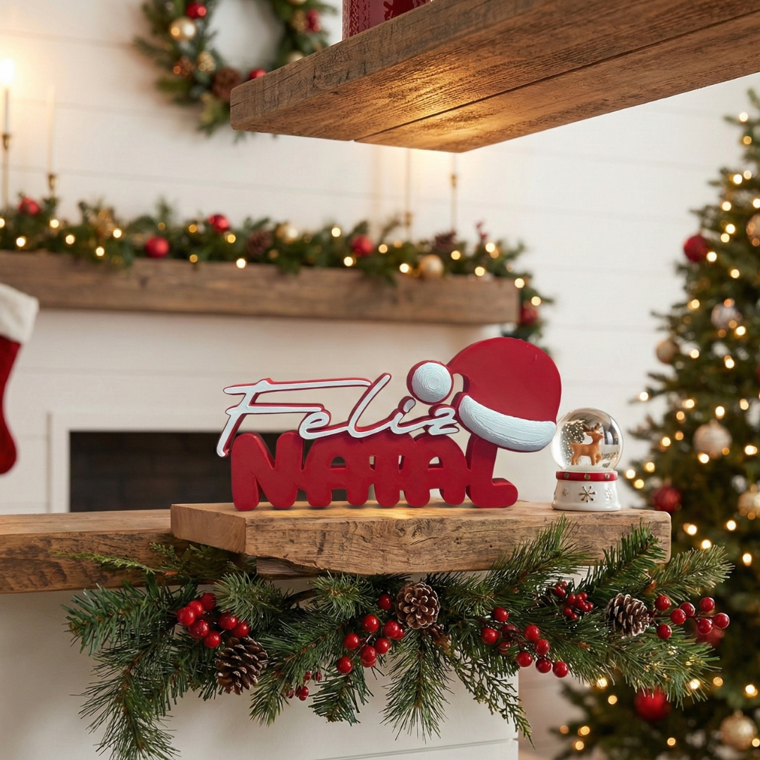 A maneira mais charmosa e direta de espalhar a magia natalina pelo seu lar! O letreiro ‘Feliz Natal’ com o detalhe icônico da touca do Papai Noel é aquela peça que transforma qualquer cantinho sem graça em um cenário de festa.